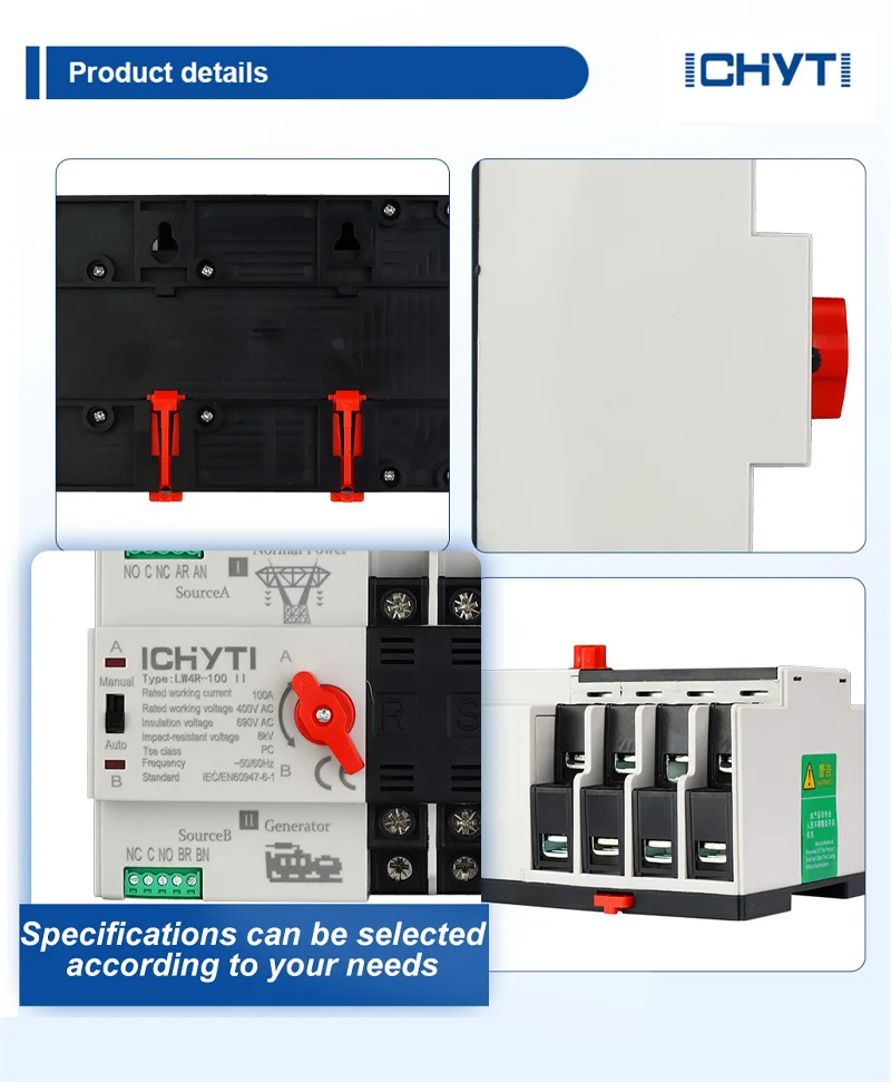 Switch Transfer Automatik Kilang Ichyti 100amp adalah sesuai untuk sistem bekalan kuasa kecemasan dengan penarafan 400V dan 100A AC pada 50 atau 60Hz. Reka bentuk padatnya, fungsi pemindahan yang boleh dipercayai, pemasangan dan penyelenggaraan yang mudah, dan jangka hayat yang panjang menjadikannya pilihan yang popular. Suis pemindahan automatik 100amp sesuai untuk pelbagai aplikasi di mana bekalan kuasa berterusan adalah penting dan boleh dikendalikan secara elektrik dan secara manual. LW2R Series 100amp Switch Automatic Switch mematuhi keperluan IEC60947-6-1 untuk suis suis dan kawalan voltan rendah.